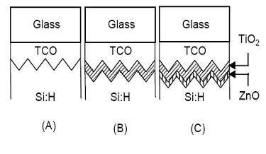 圖4. 標準電池與減反層電池的結構;(A):一般電池結構,(B):帶有TiO2減反層的電池結構,(C)帶有TiO2-ZnO的電池結構示意圖