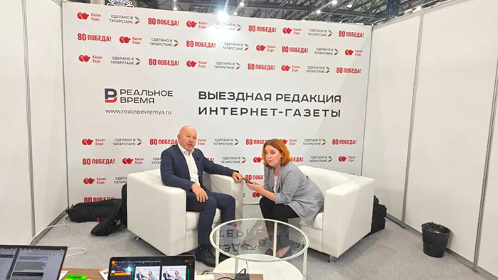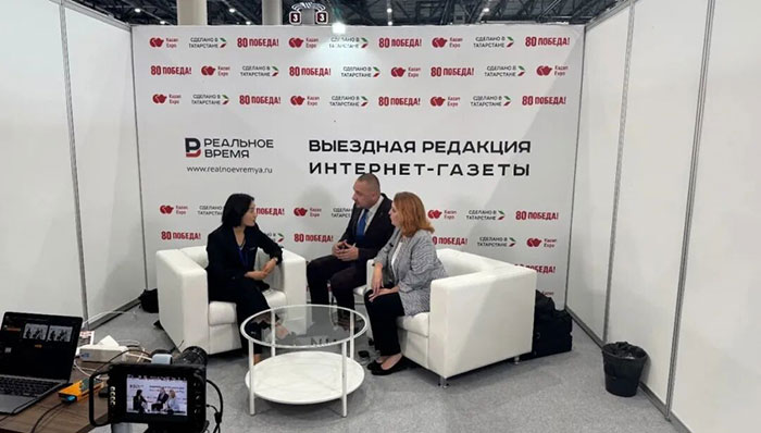 中國展團(tuán)的精彩亮相也獲得當(dāng)?shù)孛襟w廣泛關(guān)注。展會期間,俄媒體《реальное время》特邀中國展團(tuán)代表接受專訪,振威國際會展集團(tuán)董事副總裁孫宇、深圳青鈿信息科技有限公司俄羅斯分公司副總經(jīng)理康斯坦丁、北京昊圖科技有限公司副總經(jīng)理劉亞利等暢談合作前景。孫宇在采訪中表示,振威國際會展集團(tuán)始終致力于搭建高水平的國際能源合作平臺,愿借此次展會,進(jìn)一步推動中俄企業(yè)之間的務(wù)實(shí)合作。